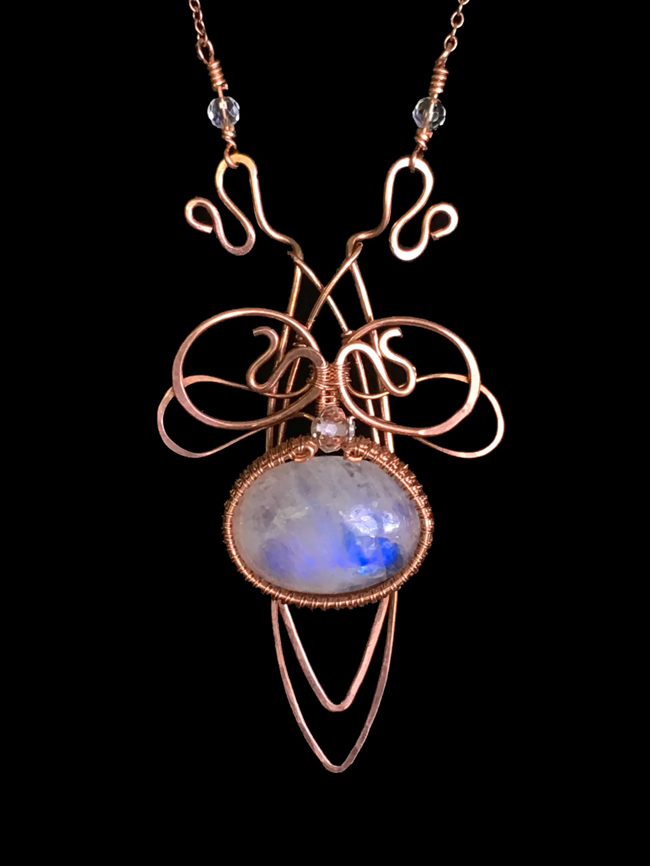 Hand-woven in 28 gauge copper wire onto a larger copper wire frame in Art Nouveau style.