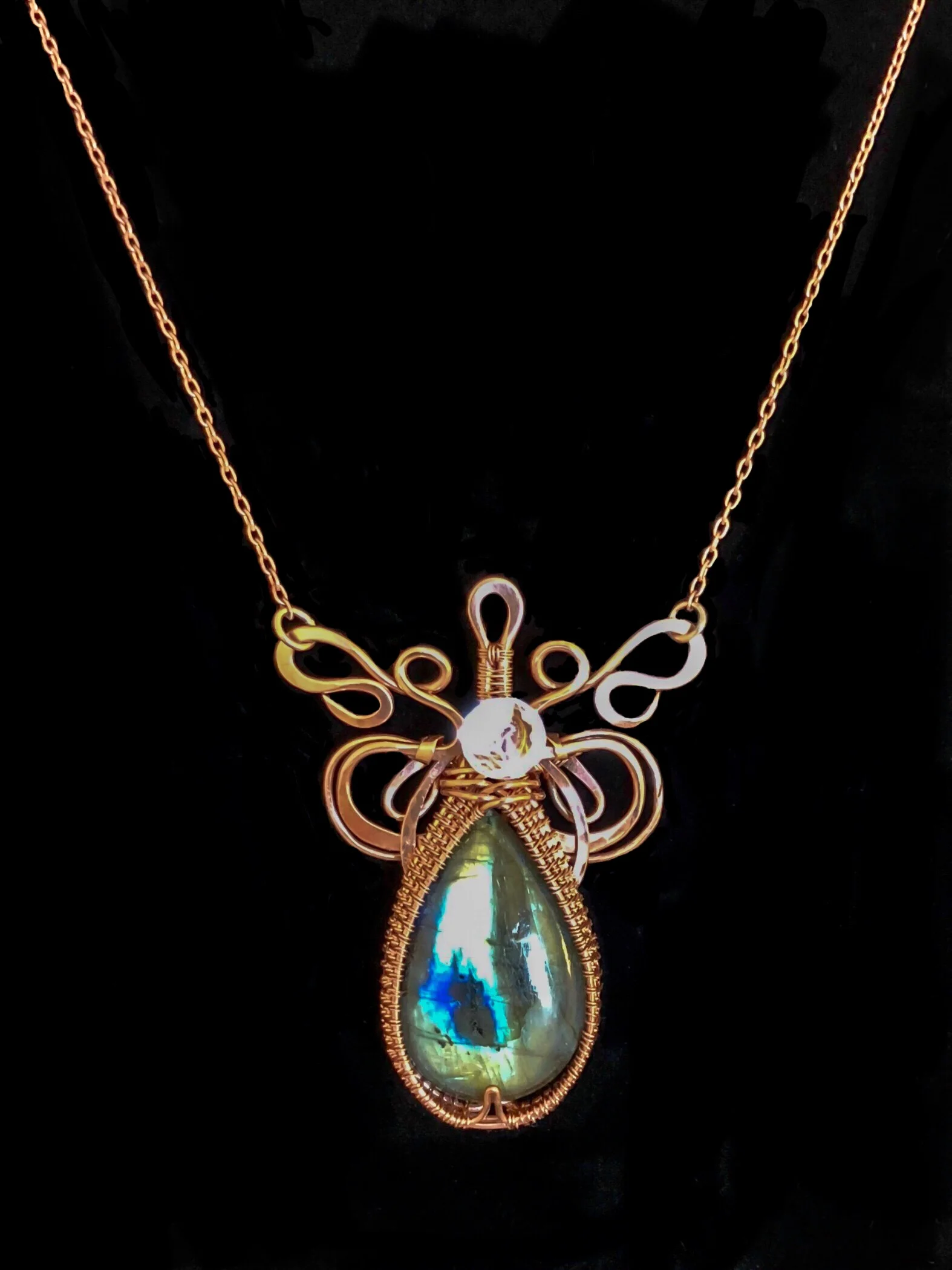 Labradorite teardrop graced by a faceted clear quartz crystal.