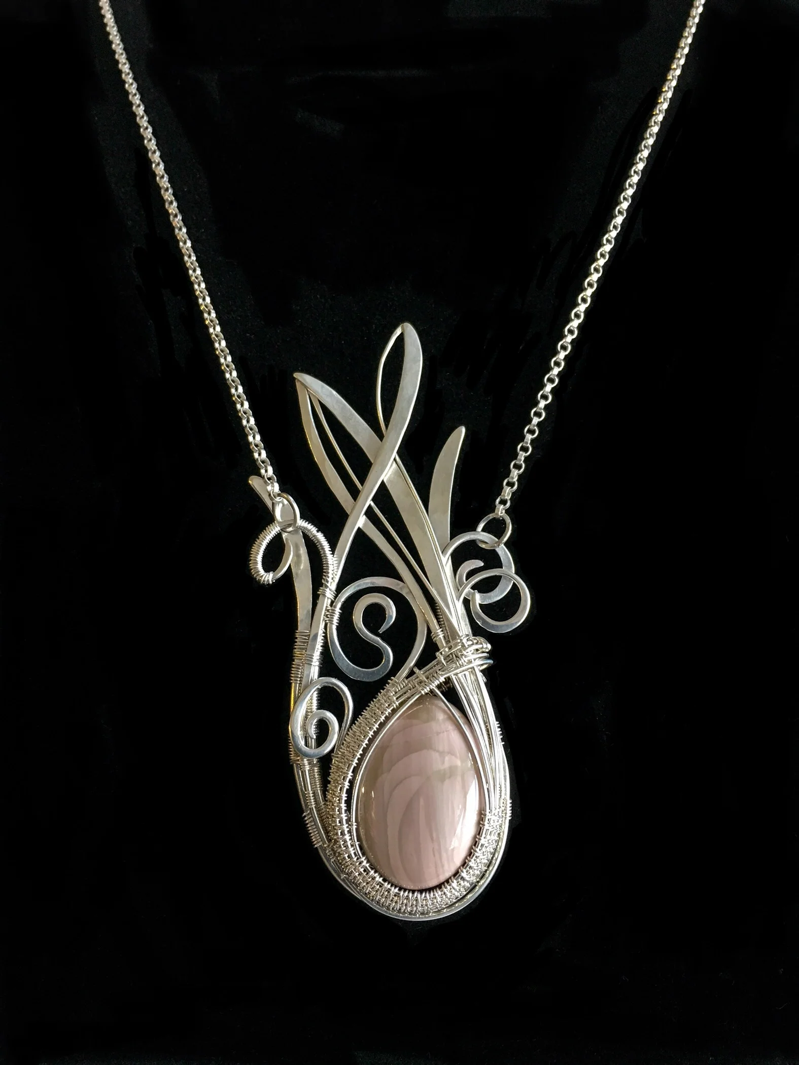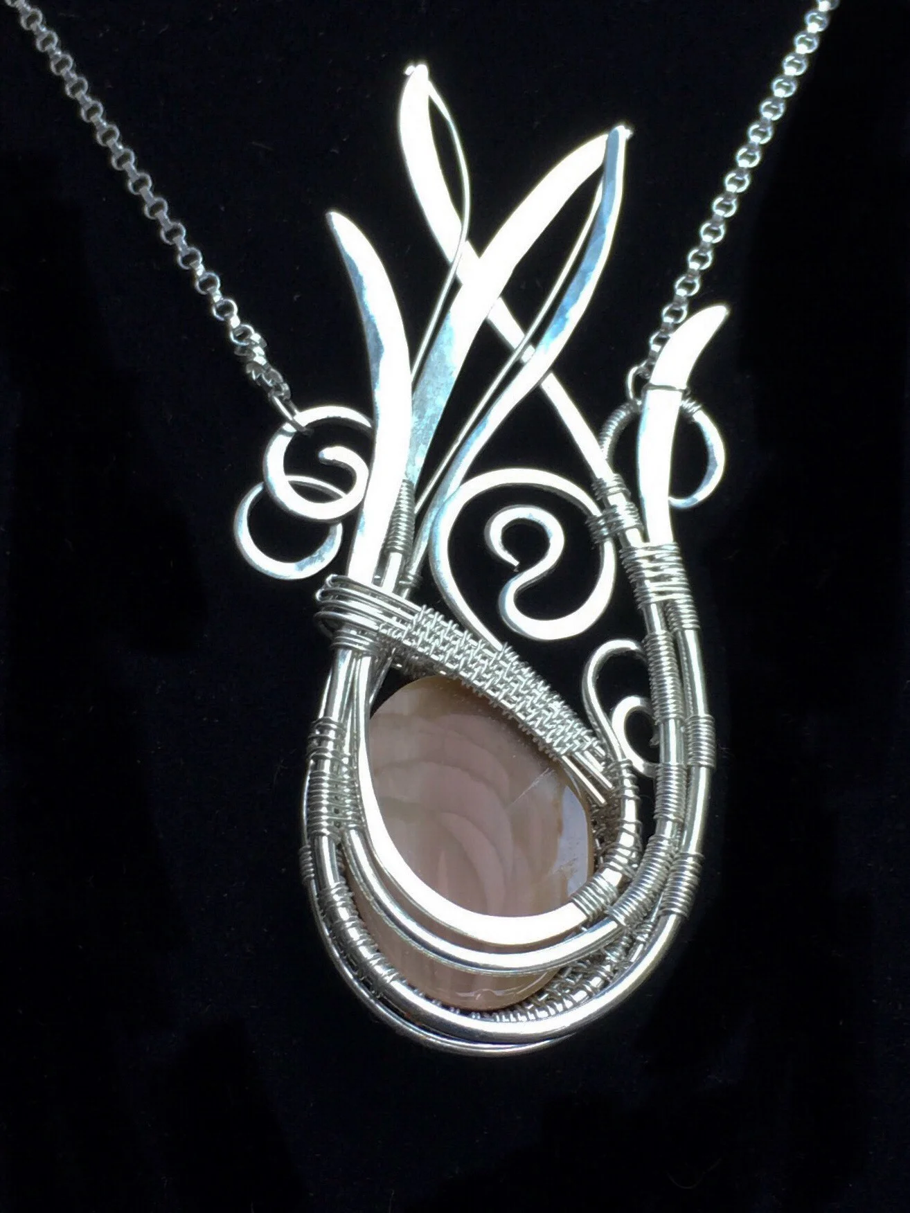 These elements are hand wrapped together with pure silver 28 gauge wire.