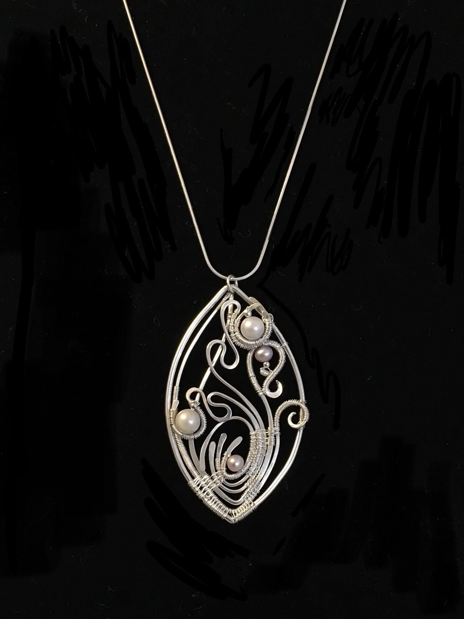 It features two white cultured pearls, three freshwater pearls and silver beads hand wrapped in pure silver wire onto sterling silver.