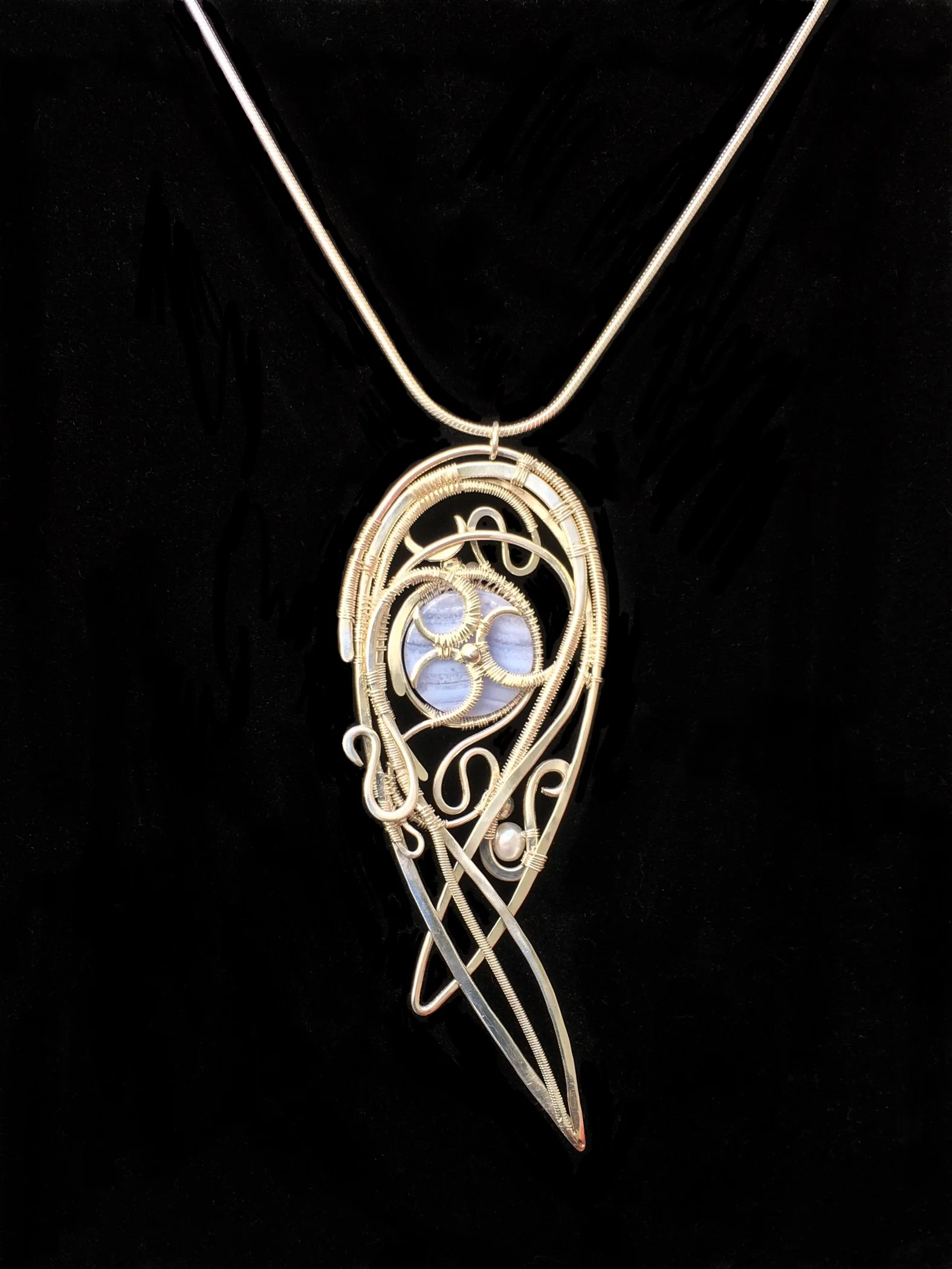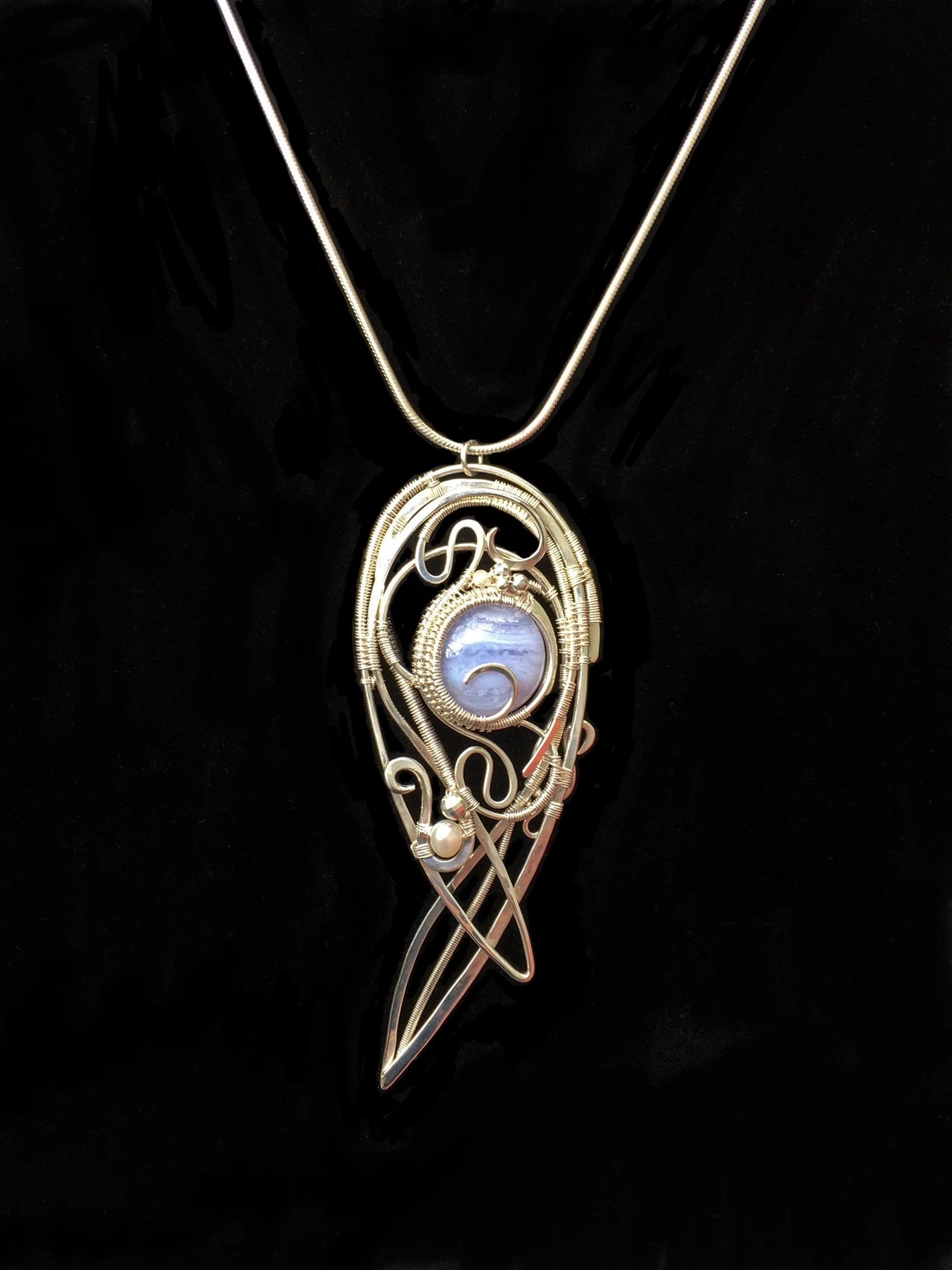 Blue lace agate gemstone, freshwater pearl and sterling beads handwrapped in pure silver onto sterling silver.